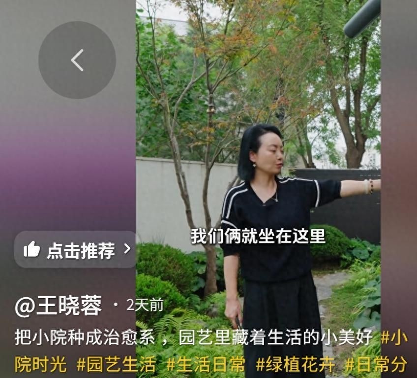 视频中,王晓蓉身穿黑色T恤搭配同色长裙,笑意盈盈地指向身旁的一排绿植,语气柔和地讲述着每株花草的故事。阳光洒落在她的肩头,一切都显得格外恬静。